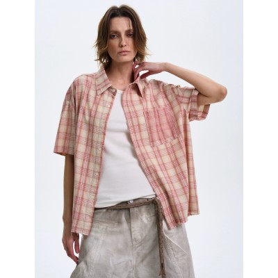Texture plaid short sleeved shirt for men and women, loose casual vintage couple's top jacket ins
